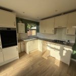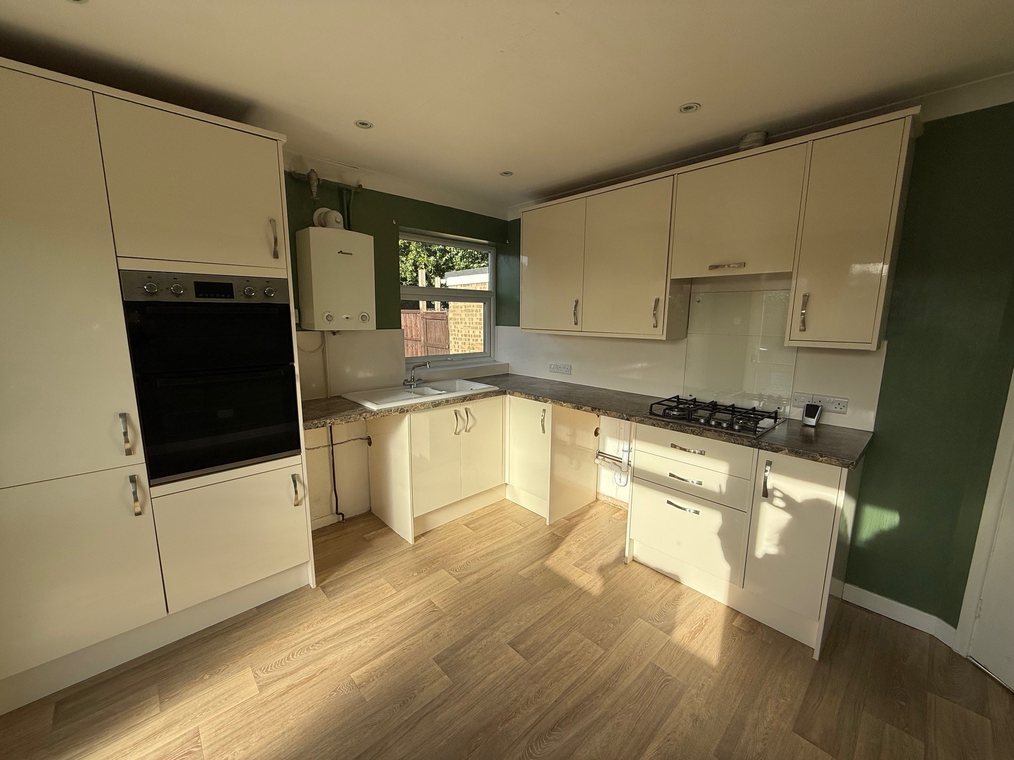 12' 5" x 11' 0" (3.78m x 3.35m) Fitted wall mounted and floor standing cream cupboards including tall larder style cupboard, complimentary work tops and splash backs, inset one and a quarter bowl porcelain sink and drainer with mixer tap, four ring gas hob with extractor fan over, eye level double electric oven, space and plumbing under worktop for automatic washing machine, further space for additional white good, wooden effect vinyl flooring, part glazed door to rear.