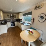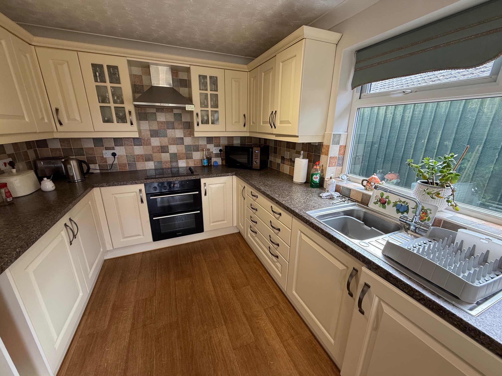 8' 8" x 17' 7" (2.64m x 5.36m) Fitted wall mounted and floor standing cream fitted cupboards including glass fronted display cabinets, complimentary work tops and splash back tiling, inset stainless steel sink and drainer with mixer taps, four ring ceramic hob with extractor canopy over, double electric oven, integrated washing machine, fridge and freezer, wooden effect vinyl flooring, radiator, TV point, French doors to outside.