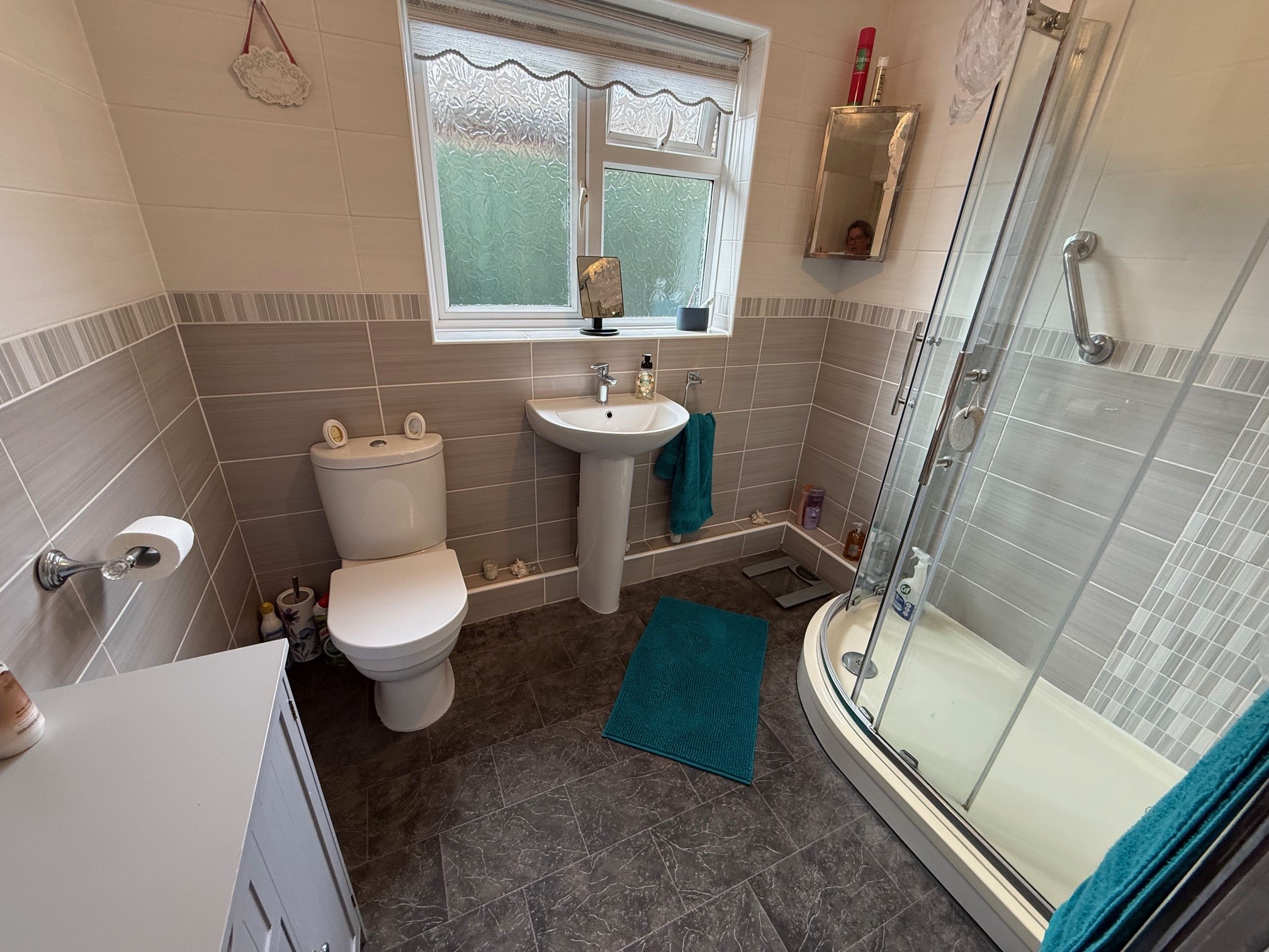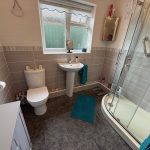 Corner shower cubicle with curved glass door, pedestal wash hand basin, low level WC with concealed flush, fully tiled walls, vinyl flooring, chrome heated ladder towel rail.
