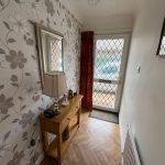 Part glazed front door to Entrance hallway: Radiator, laminate flooring, access to roof storage space, deep storage cupboard, airing cupboard housing gas central heating boiler and shelving.