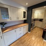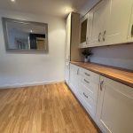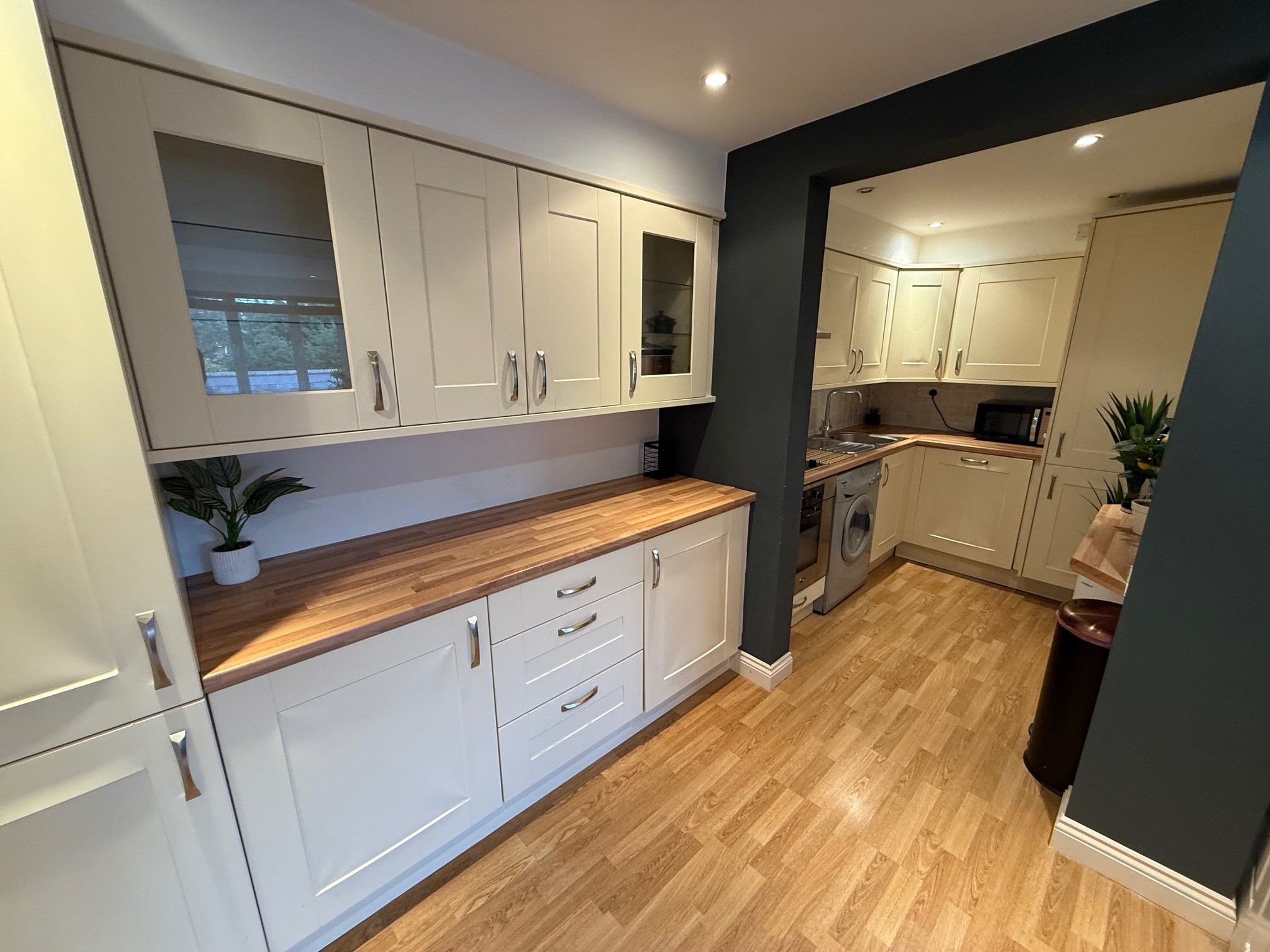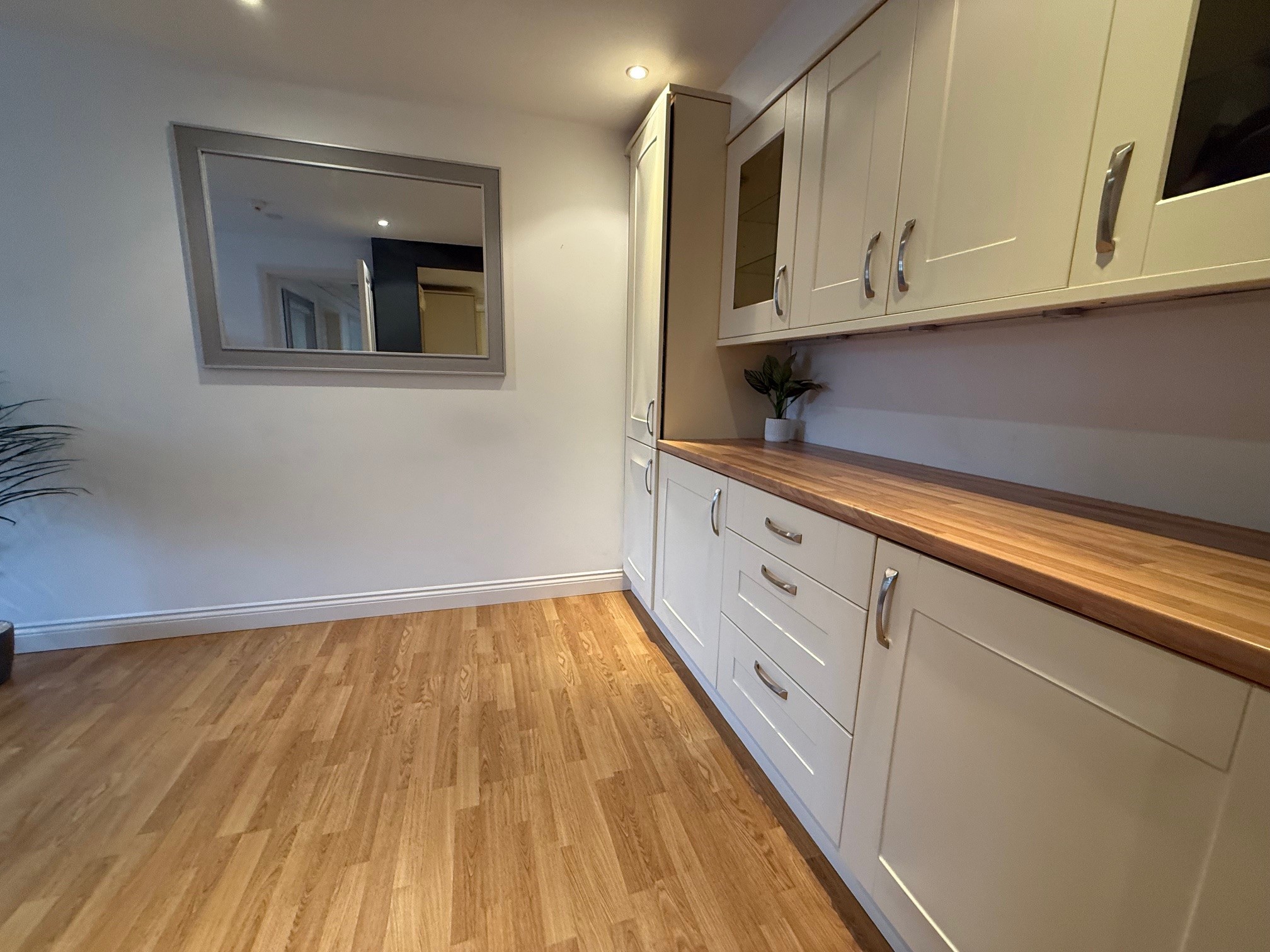 6' 4" max x 15' 4" max (1.93m x 4.67m) Fitted wall mounted and floor standing cream cupboards including a tall larder style cupboard and a glass fronted display cupboard, wooden effect fitted worktop and complimentary splash back tiling, integrated fridge, four ring ceramic hob with extractor canopy over, electric oven, space and plumbing under worktop for automatic washing machine which is included in this sale, inset stainless steel sink and drainer with mixer tap, wall mounted cupboard housing hot water tank and shelving, integrated dishwasher, laminate flooring with under floor heating, inset ceiling spot lights.