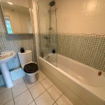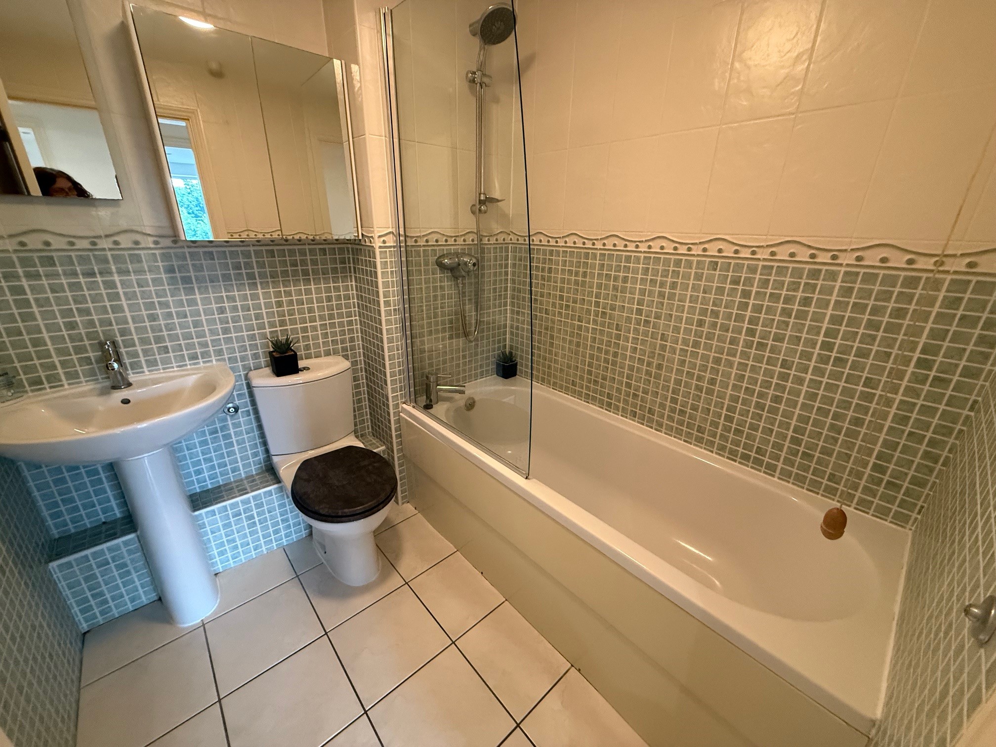 6' 4" x 6' 2" (1.93m x 1.88m) Panelled bath with shower over and glass screen, low level WC with concealed flush, pedestal wash hand basin, fully tiled walls, ceramic floor tiles, under floor heating, electric shaver point, extractor fan.