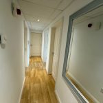 Front door with intercom telephone door entry to Hallway: Laminate flooring, under floor electric heating, inset ceiling spot lights, wall mounted thermostatic heating control.