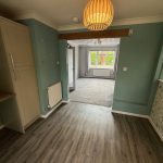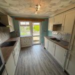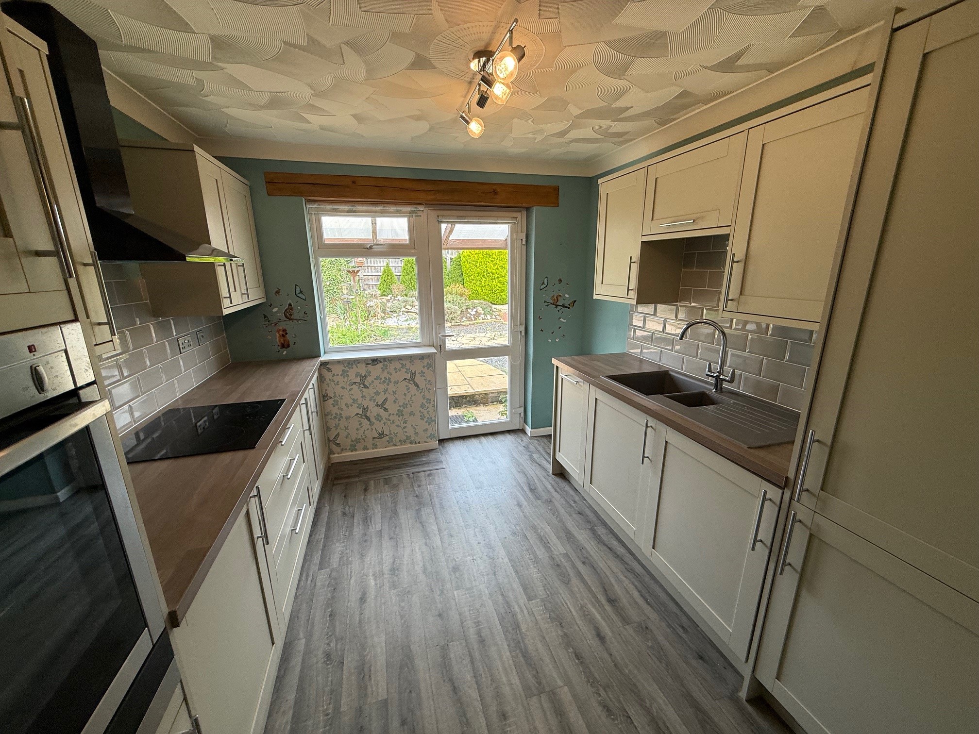 9' 11" x 9' 4" (3.02m x 2.84m) Fitted wall mounted and floor standing cupboards including three deep pan drawers, complimentary wooden effect worktops, inset one and a quarter bowl polycarbonate sink and drainer, splash back tiling, four ring ceramic hob with extractor canopy over, eye level electric oven, integrated slim line dishwasher, integrated fridge and freezer, laminate flooring, radiator, part glazed uPVC door to outside.