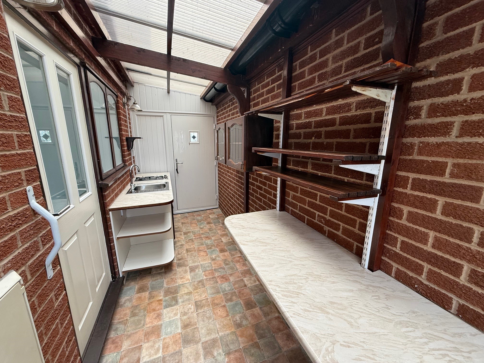 5' 1" x 17' 5" (1.55m x 5.31m) Floor standing cupboards with fitted worktop, inset stainless steel sink with mixer tap, two ring gas hob, further fitted worktop to opposite wall with space under for white goods, laminate flooring, radiator, doors at both ends opening to front and rear garden, door off to occasional third bedroom or hobby room.