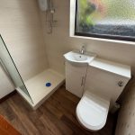 Double width shower cubicle with MIRA electric shower over, wash hand basin, low level WC with concealed flush, complimentary splash back tiling, radiator, laminate flooring.