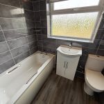 Low level WC with concealed flush, wall mounted wash hand basin, complimentary splash back tiling, laminate flooring.