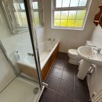 5' 10" x 8' 9" (1.78m x 2.67m) Panelled bath, low level WC with concealed flush, pedestal wash hand basin, separate shower cubicle with glass door, complimentary splash back tiling, ceramic floor tiles, radiator, wall mounted electric heater.