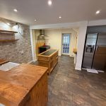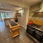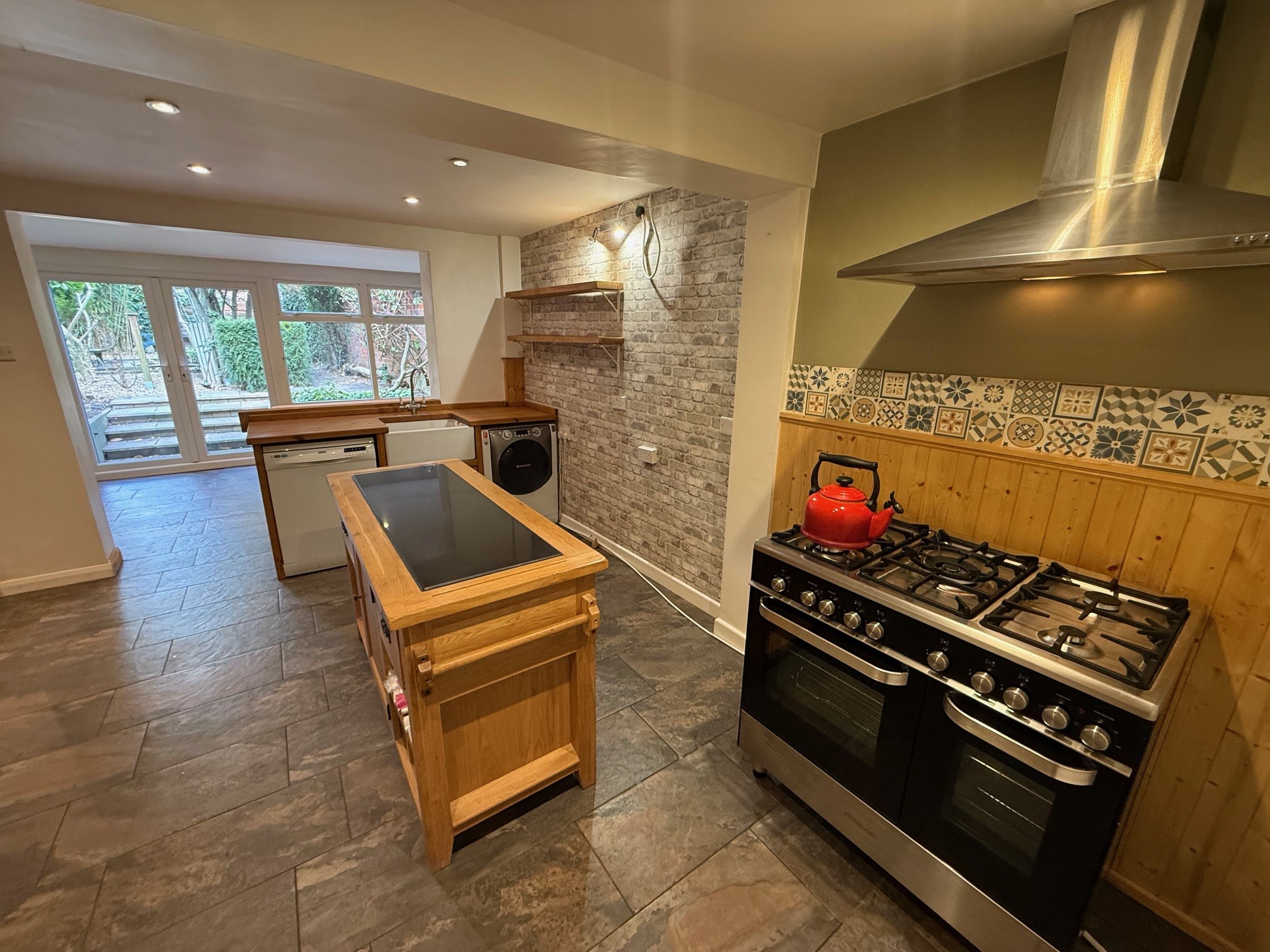 Kitchen 9'6" x 14'6" Fitted wooden worktop with inset porcelain Belfast sink with mixer tap, space and plumbing under worktop for dishwasher and washing machine, free standing butchers block unit with polished stone worktop drawers and cupboard under, space for large American style fridge freezer, five ring gas hob and electric range style cooker with extractor canopy over, built in storage cupboard, radiator, tiled flooring, inset ceiling spot lights, glazed door through to Lounge. Open through to Conservatory. Please note all appliances and butchers block can be included in this sale.